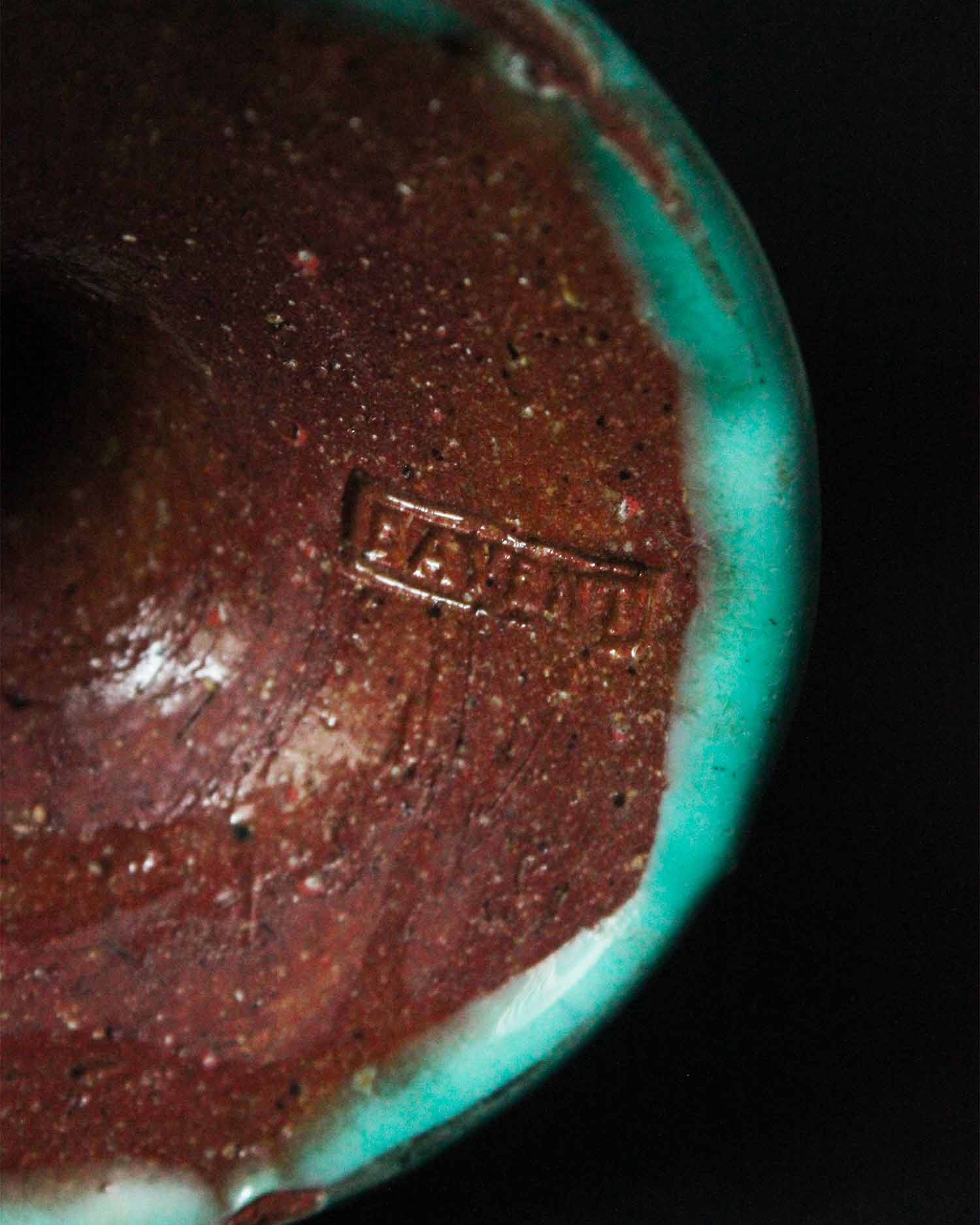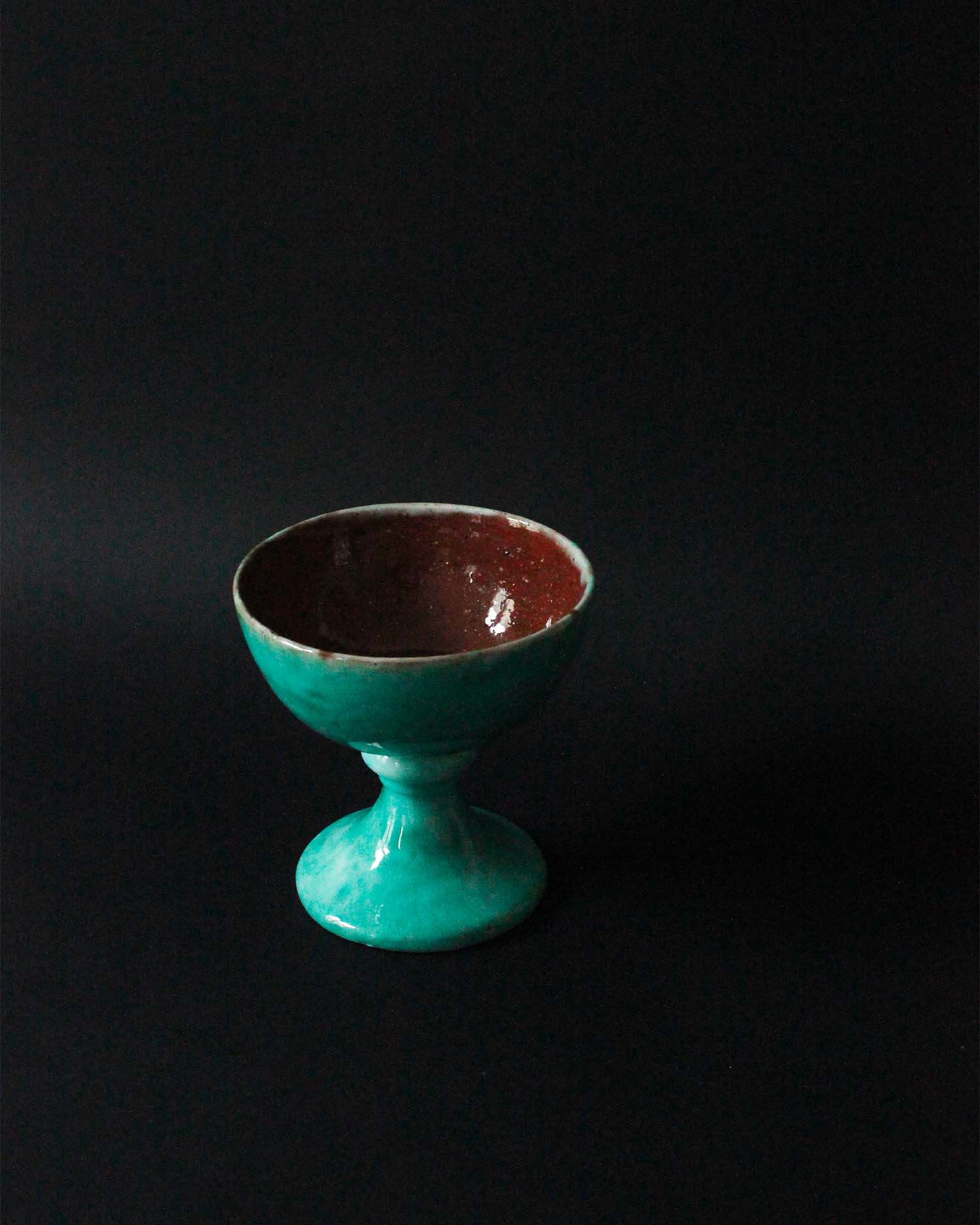 Standing cup or chalice in cloudy lagoon green glazed terracotta, caramel interior. Stamped “Bavent” on the base.