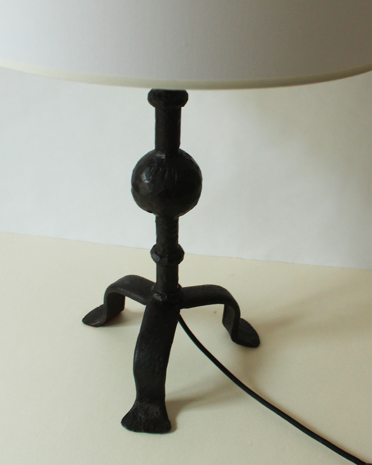 Le travail de forge laisse apparître des irrégularités qui font tout le charme de cette pièce artisanale. De belle dimension et à la présence élégante et affirmée, cette lampe peut servir sur un bureau, une enfilade, une cheminée...