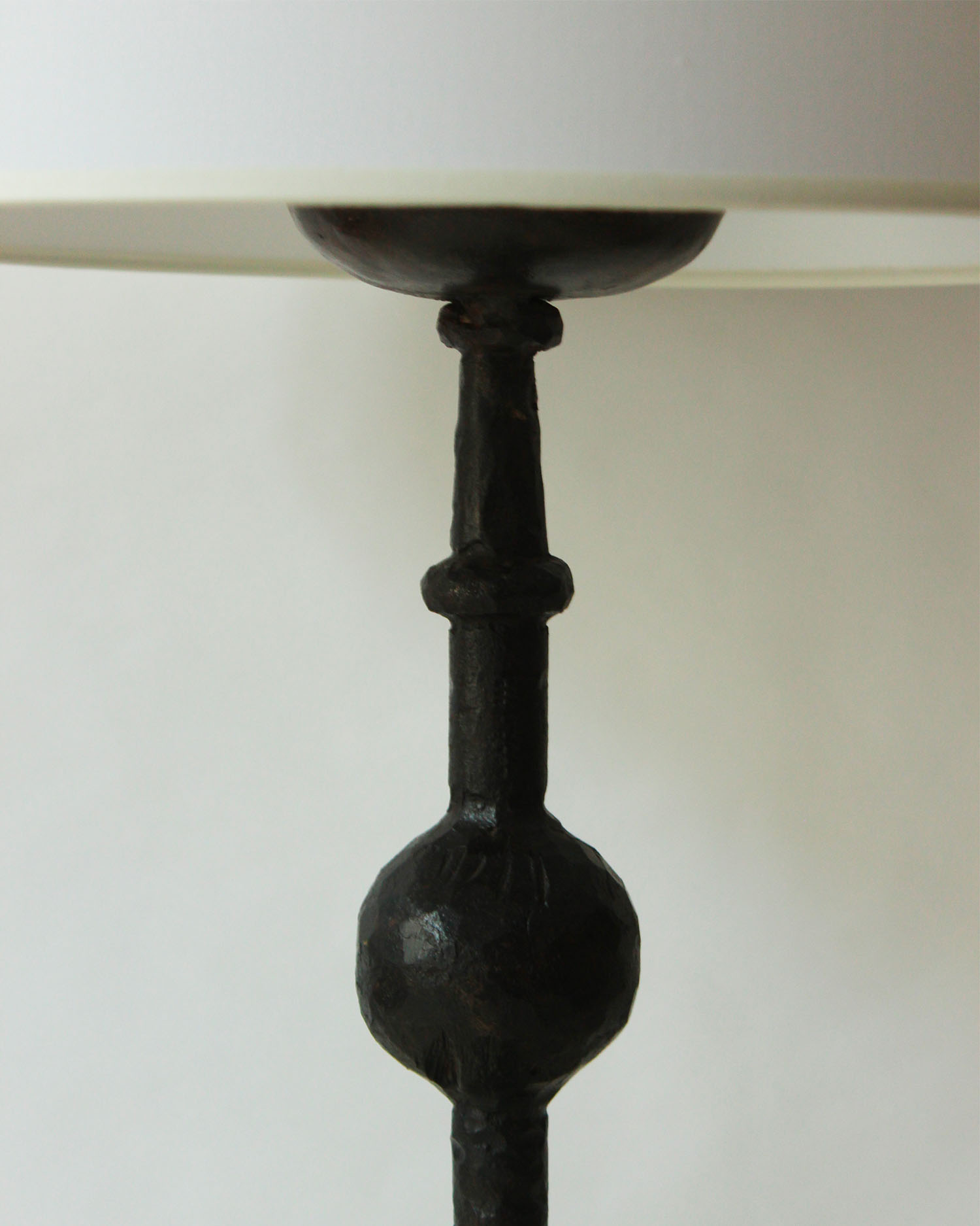 Grande lampe de table en fer forgé à patine noire, travail artisanal français. Probablement anciennement un pique-cierge transformé en lampe, cette pièce rappelle les luminaires dessinés par Alberto Giacometti dans son côté sculptural.